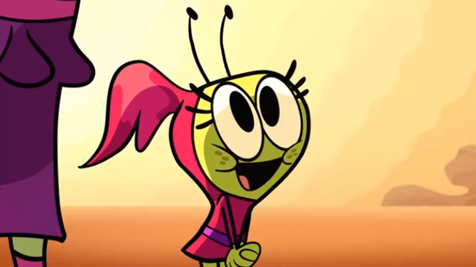 Olive is a humanoid alien of short stature, with olive green skin and a pair of antennas. She wears a pink dress, skirt with a purple belt and purple boots. What seems like hair, which is the same color as her clothing, is seen coming out of the end of her head.