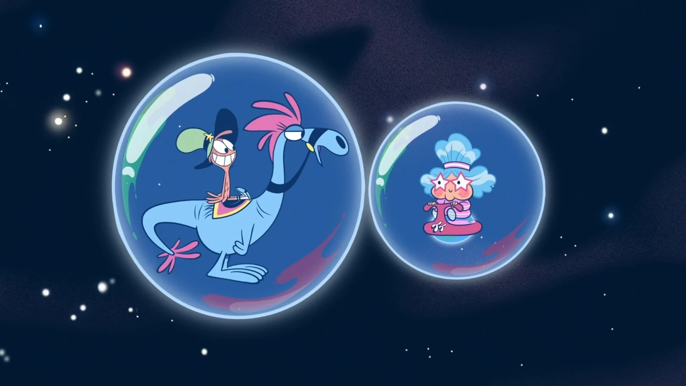 On Planet Ziziks, Wander is conversing with another space traveler, about all the places she went to. Sylvia, who just ordered a Flarvarian Float, meets the new space explorer, who introduces herself as Trudi Traveler, and is surprised about the fact she's been to as many places as Wander. However, when she mentions the "flooshy slooshy sloosh", something Wander didn't see, she adds he's young and he'll catch up someday. Right after she leaves, Wander tells Sylvia he wants to see the "flooshy slooshy sloosh" and she agrees to put their vacation on the planet on hold so he can see it.